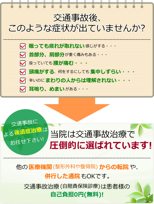 自賠責保険での治療になるので、患者様の負担はございません。